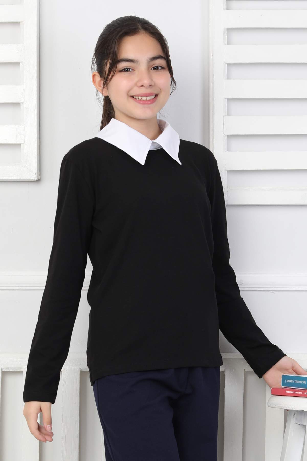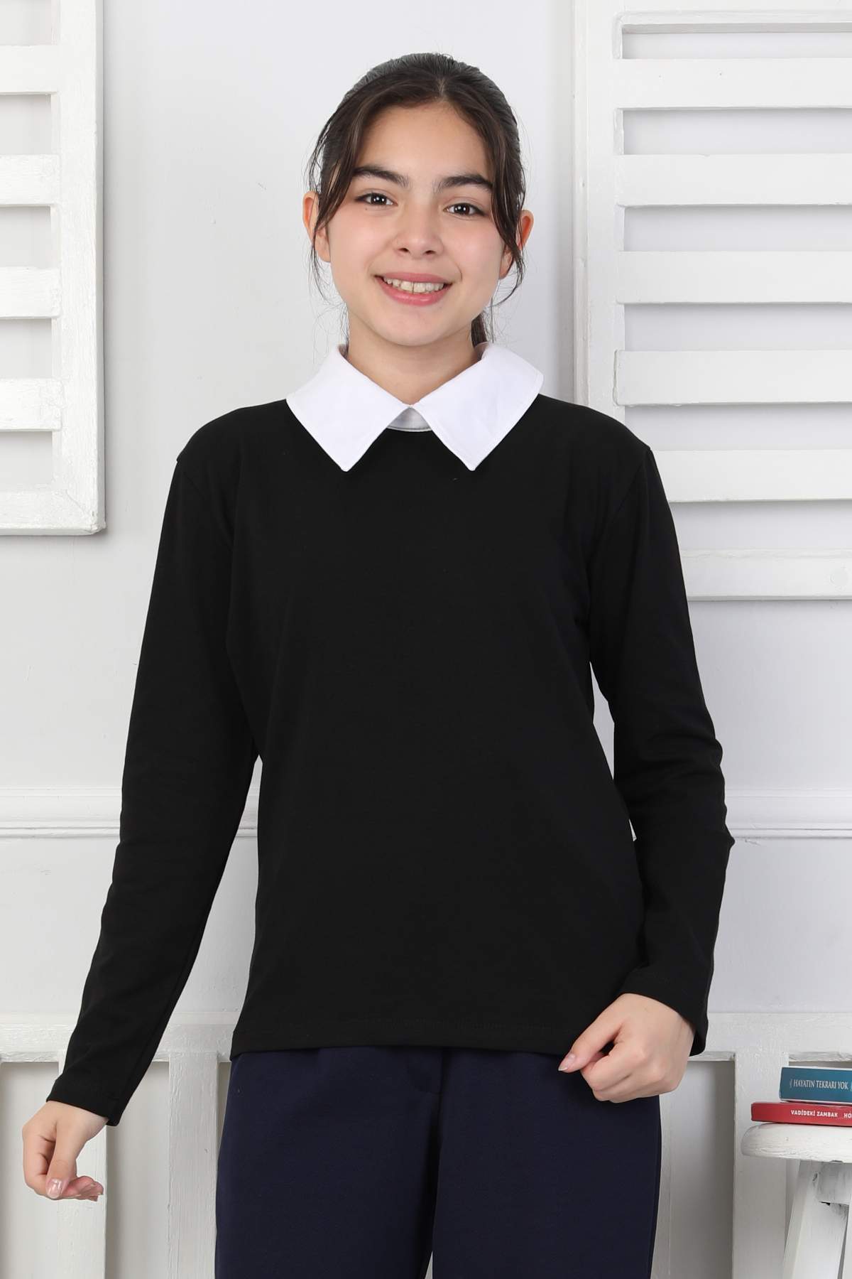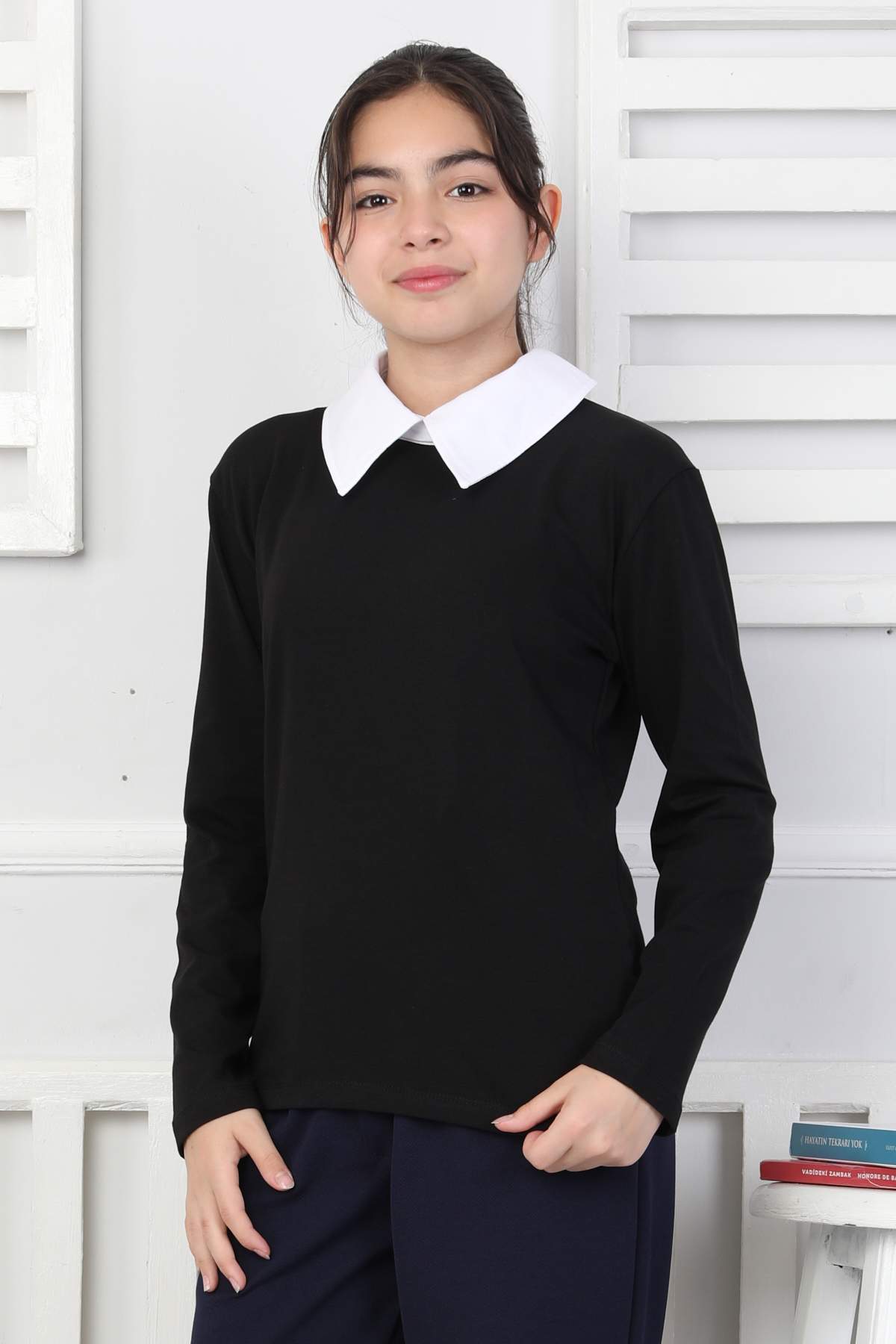 ORTA DÜZ POPLİN YAKA UZUN KOLLU OKUL – SİYAH