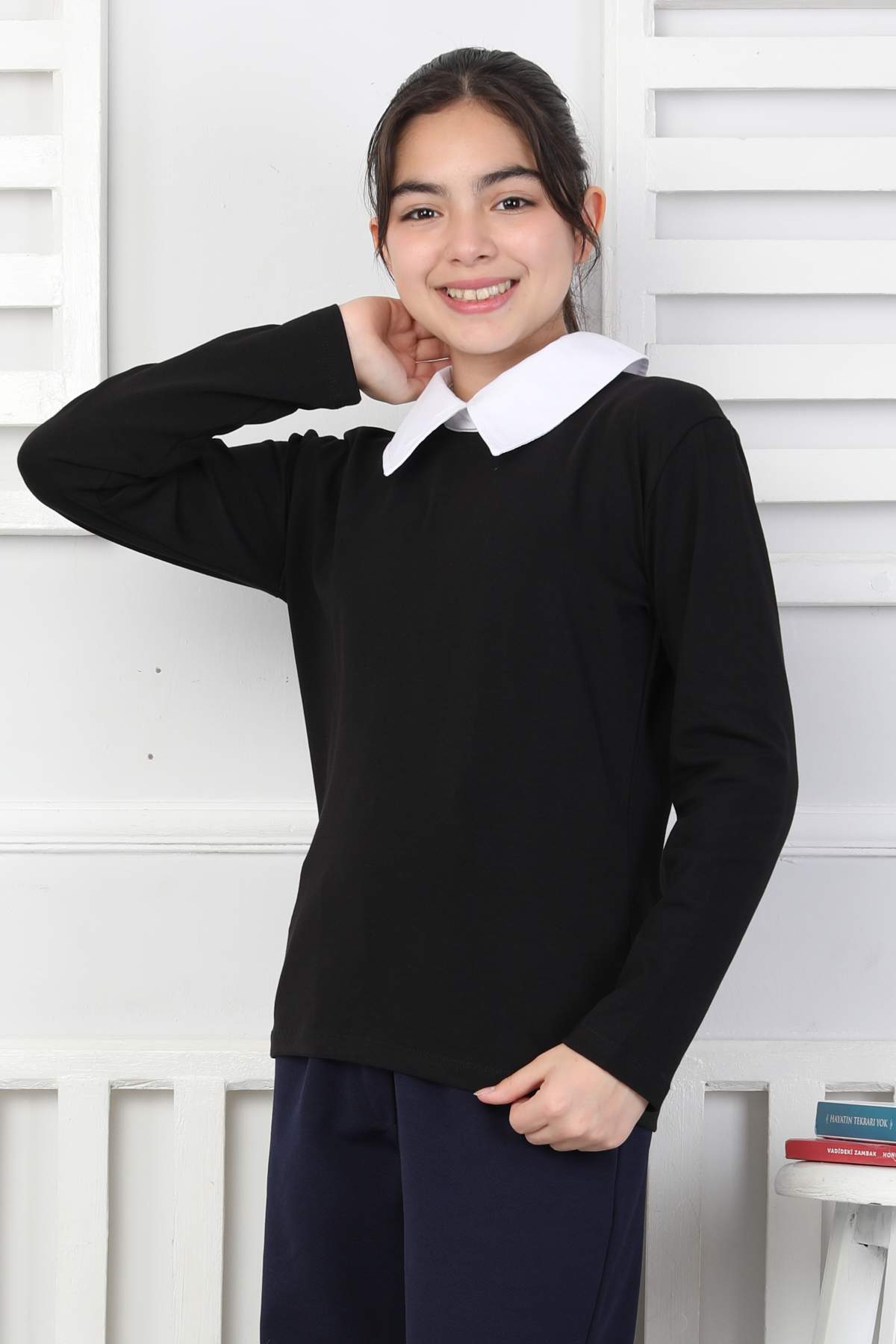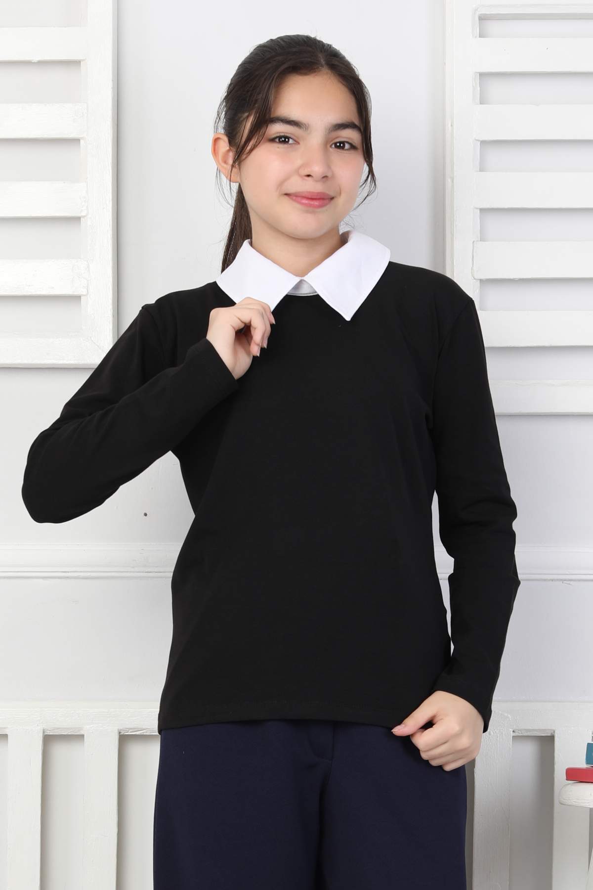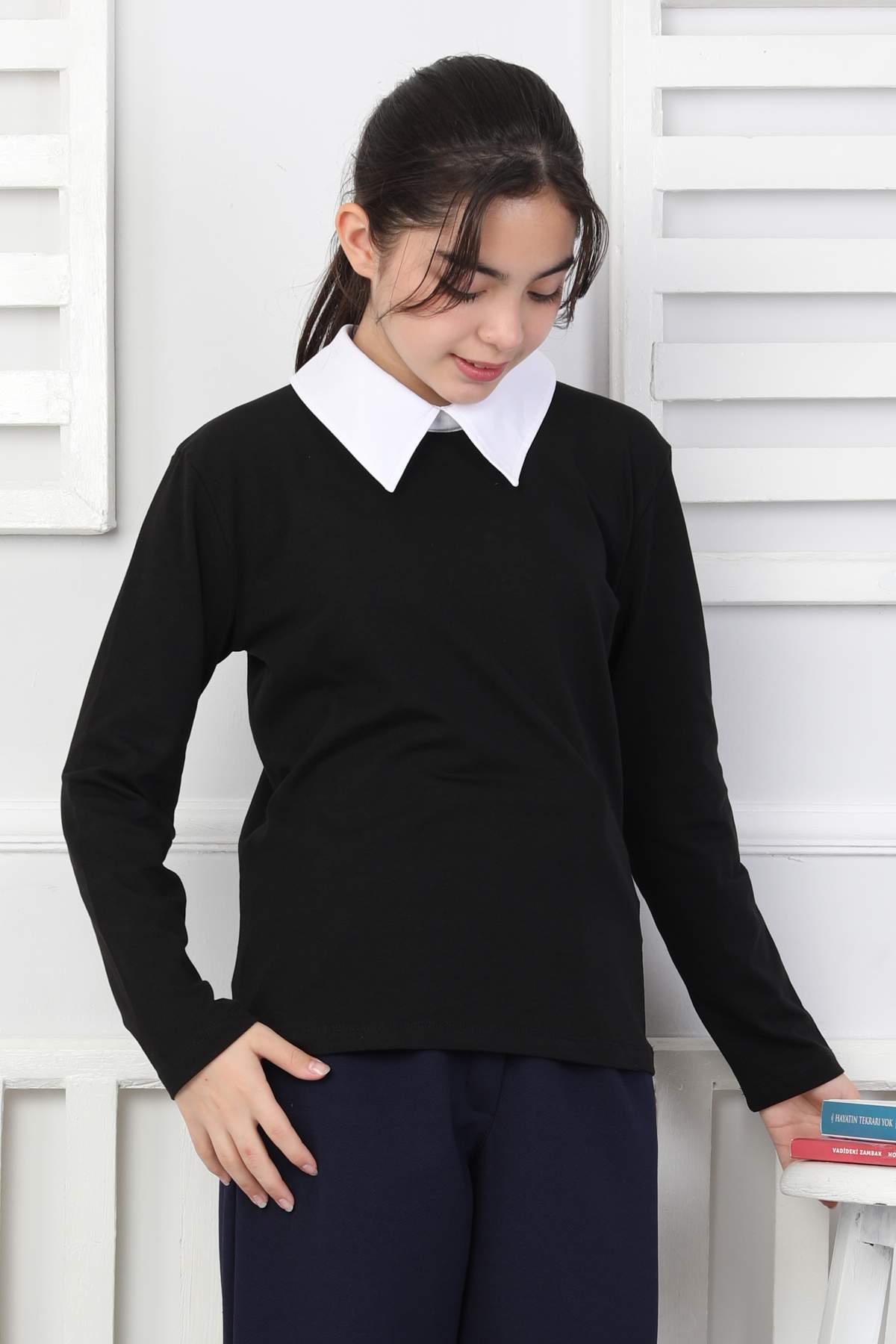 ORTA DÜZ POPLİN YAKA UZUN KOLLU OKUL – SİYAH
