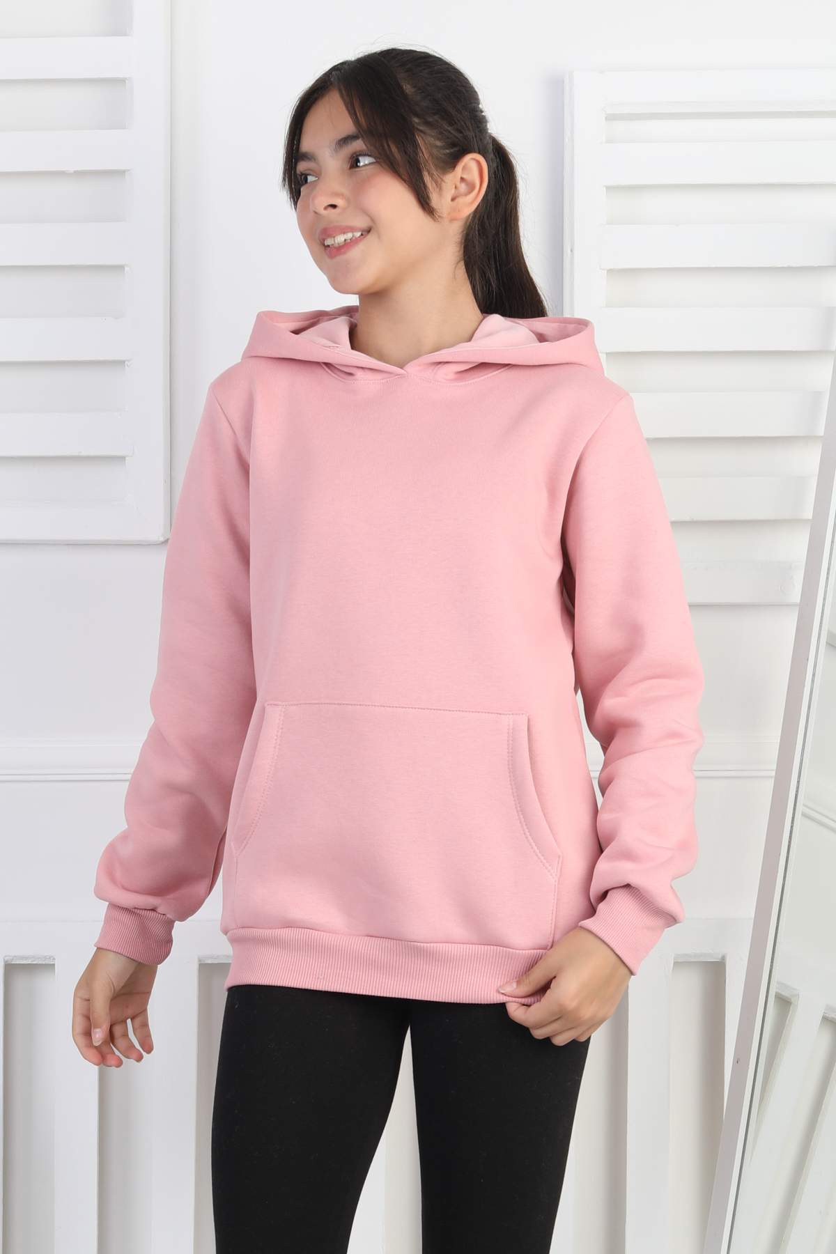 SWEET GARSON ÜÇ İPLİK KANGURU CEPLİ KAPİŞONLU BASKISIZ – PEMBE