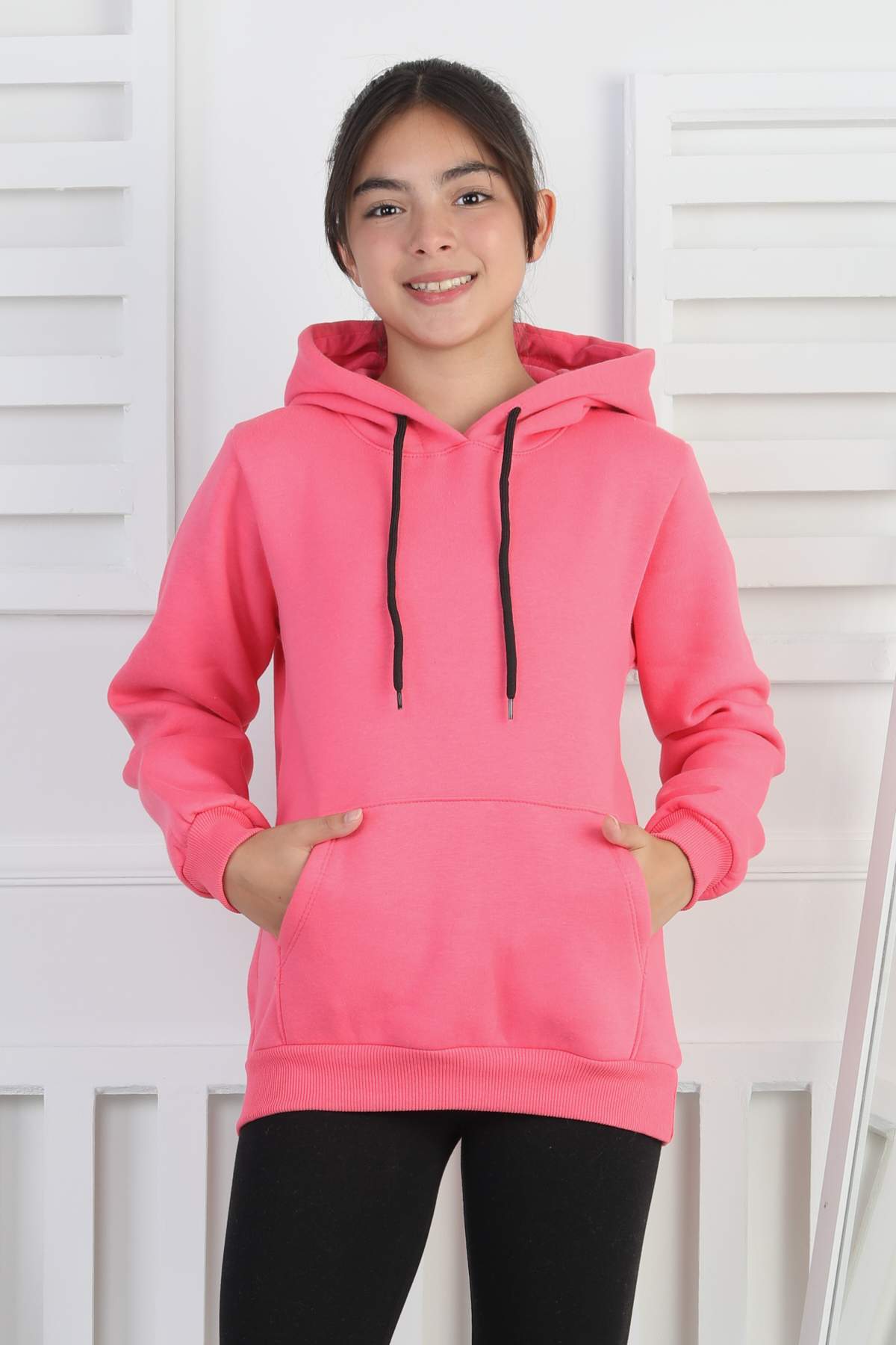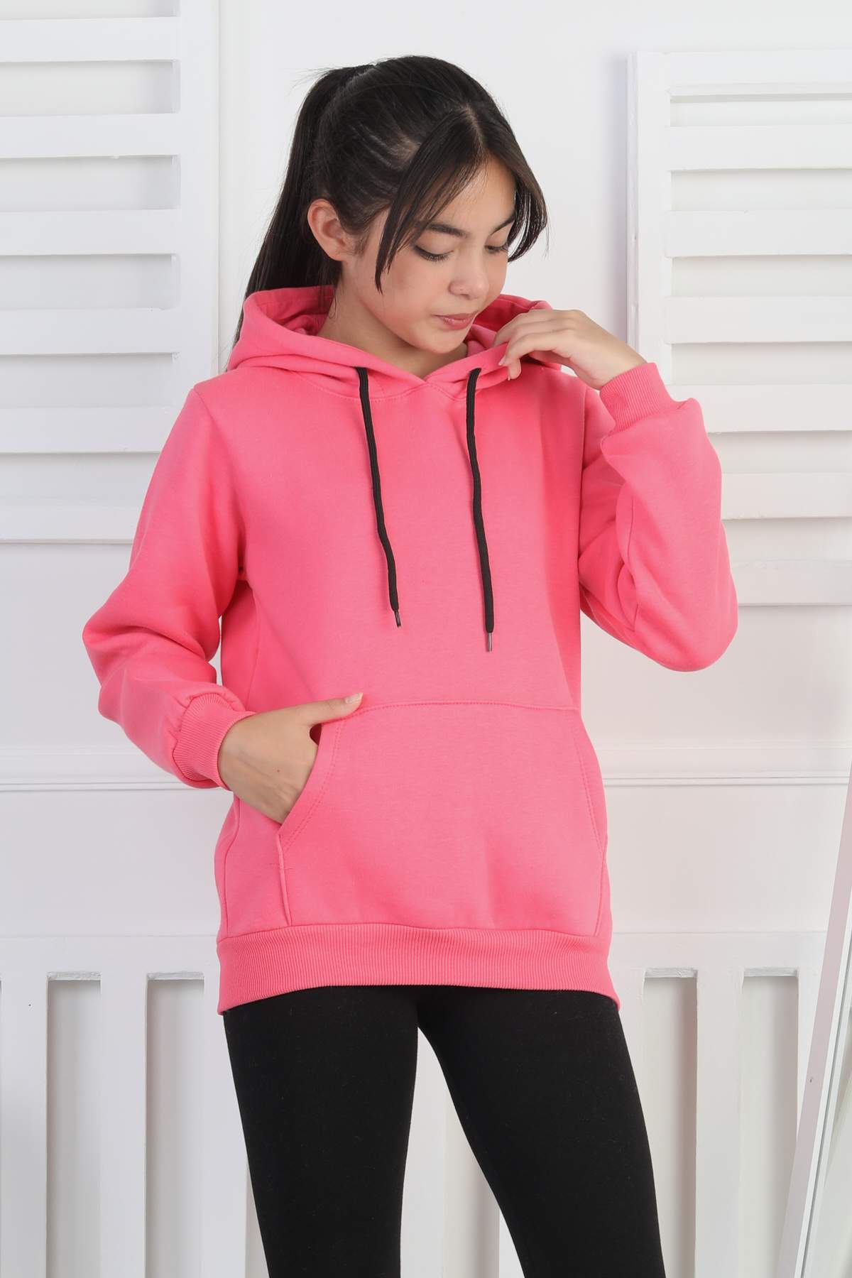 SWEET ORTA ÜÇ İPLİK KANGURU CEPLİ KAPŞONLU BASKISIZ – GÜL KURUSU