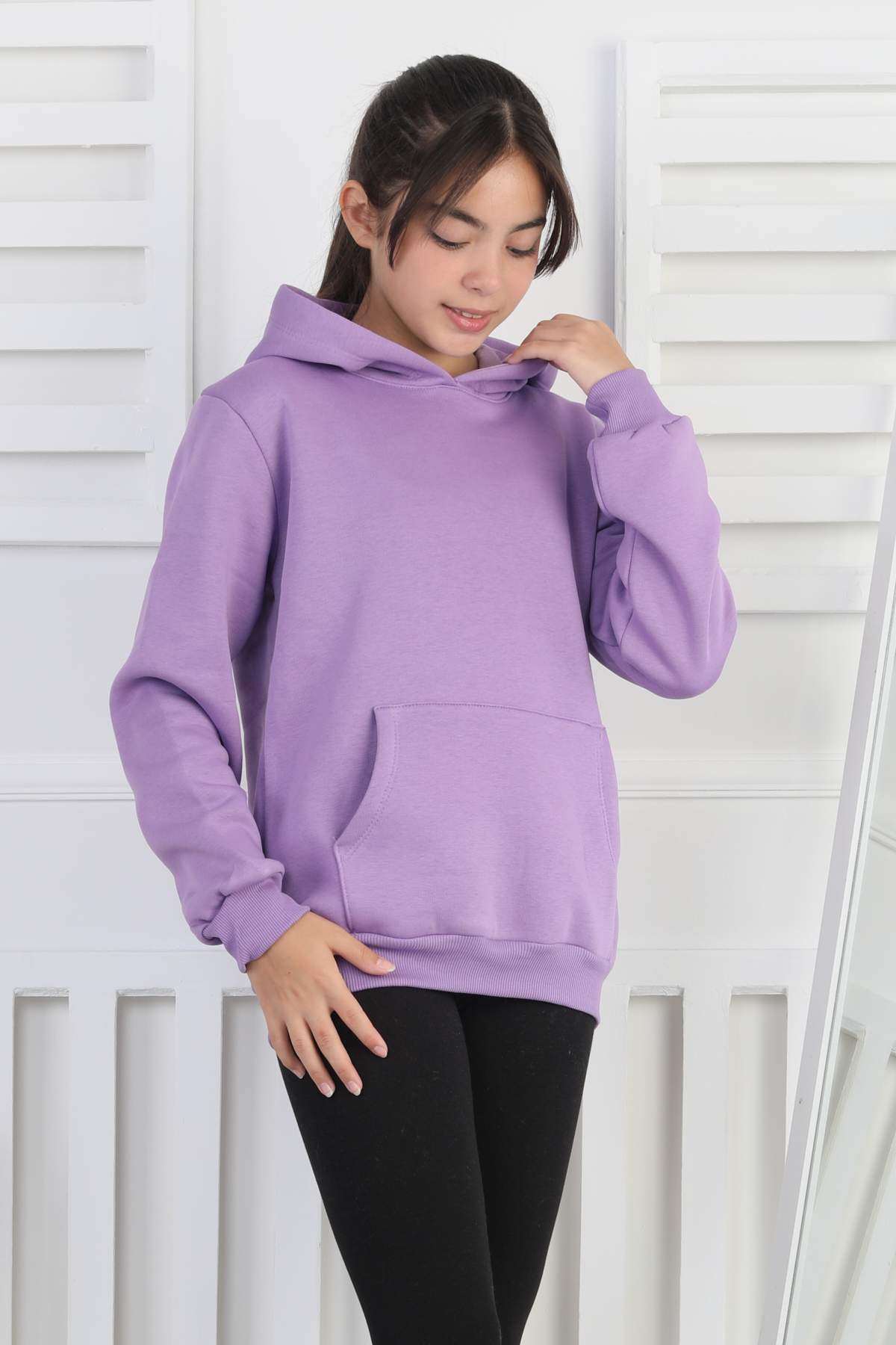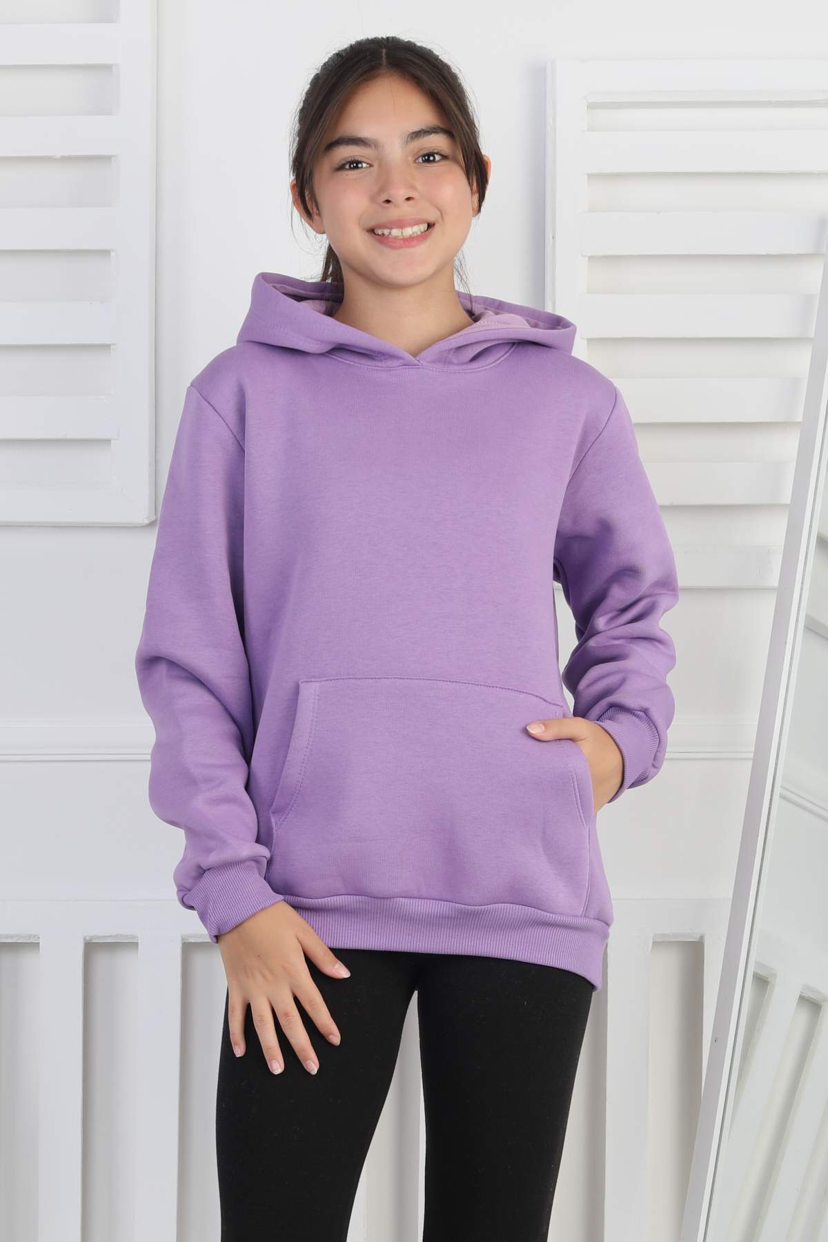 SWEET ORTA ÜÇ İPLİK KANGURU CEPLİ KAPŞONLU BASKISIZ – LİLA