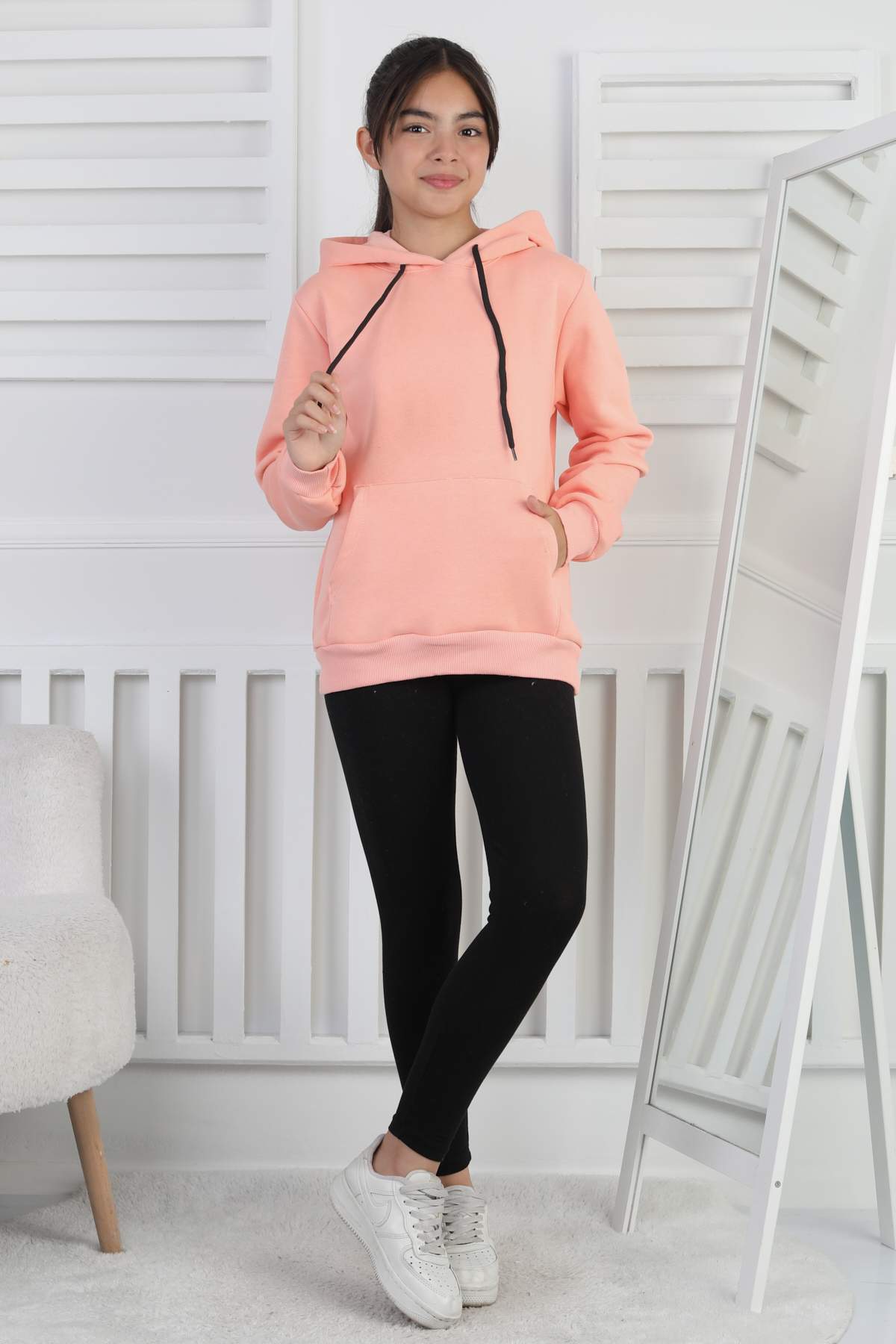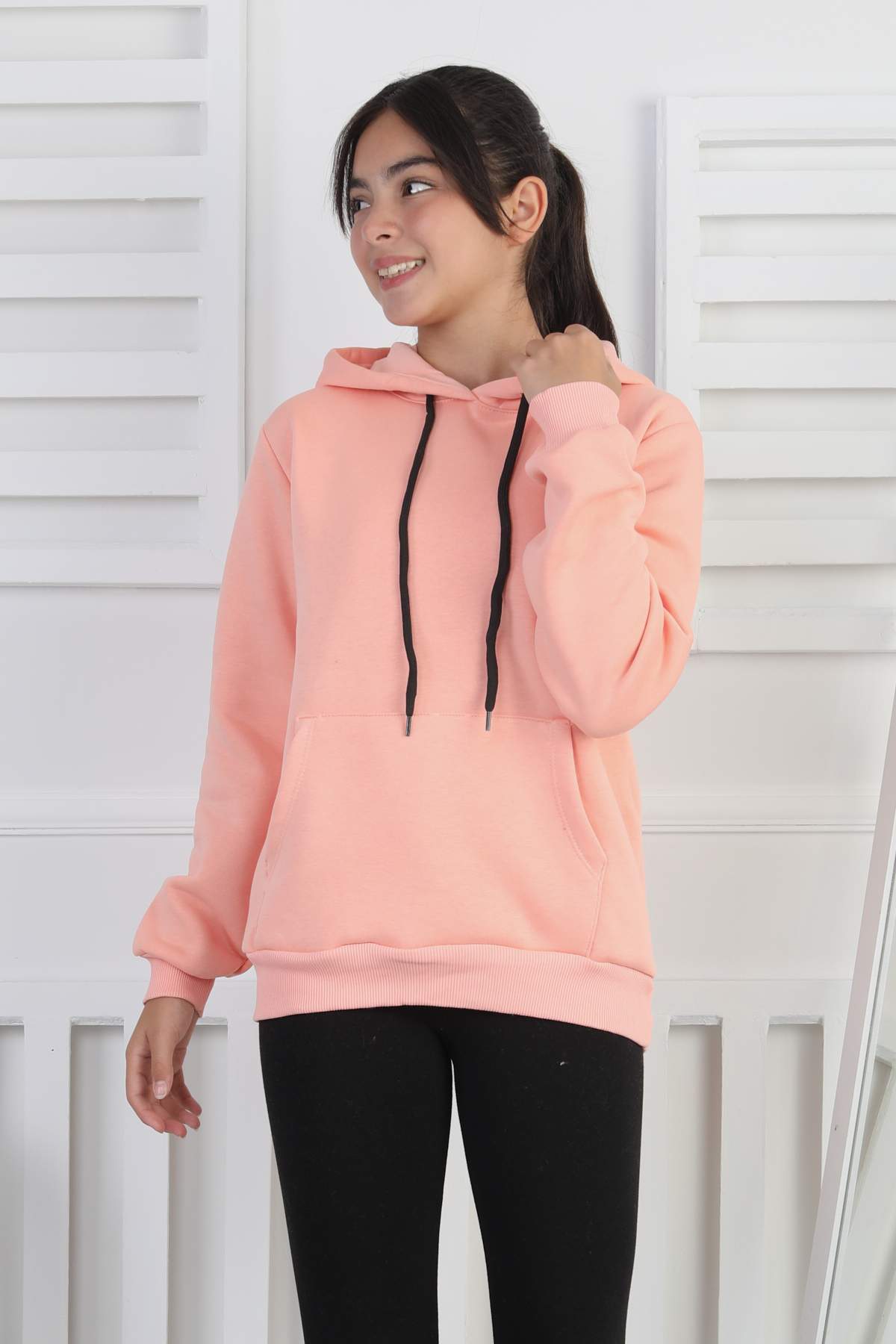 SWEET ORTA ÜÇ İPLİK KANGURU CEPLİ KAPŞONLU BASKISIZ – PUDRA